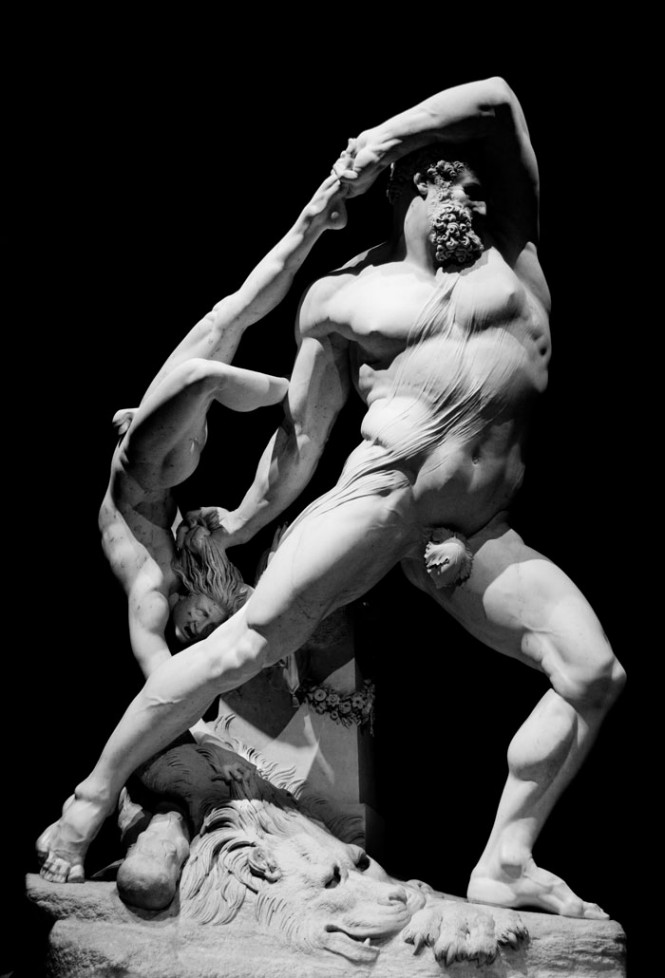 Το άνοιγμα των χεριών του Ηρακλή και η πρόταση του σώματος αφήνει όλο το μυικό του σύστημα να διαγραφεί.